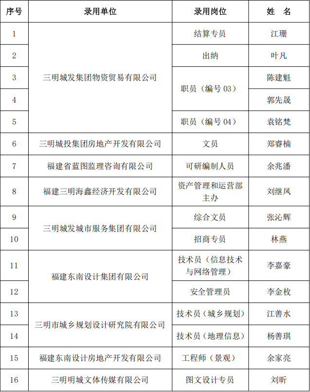 根據(jù)市城發(fā)集團2025年4月17日發(fā)布的招聘公告,通過報名、資格審查、面試、筆試等程序,現(xiàn)將擬錄用人員名單公示如下: