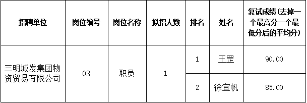 根據(jù)三明市城市建設(shè)發(fā)展集團(tuán)有限公司關(guān)于公開(kāi)招聘工作人員的公告(2025年4月17日發(fā)布),經(jīng)復(fù)試考核,現(xiàn)將成績(jī)公告如下: