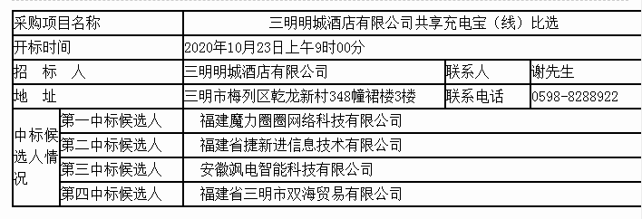 三明明城酒店有限公司共享充電寶(線)比選中標公示