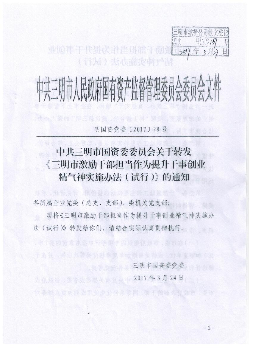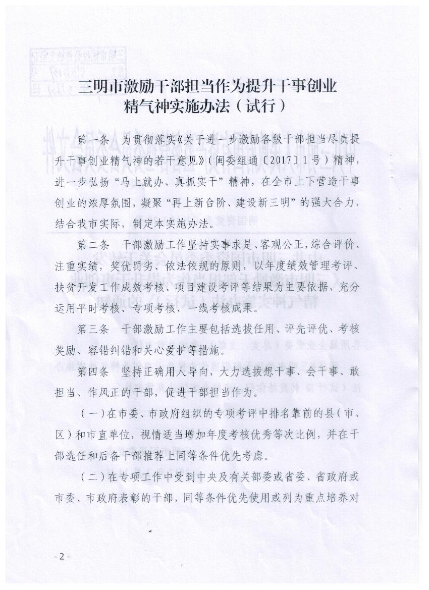關(guān)于轉(zhuǎn)發(fā)《三明市激勵(lì)干部擔(dān)當(dāng)作為提升干事創(chuàng)業(yè)精氣神實(shí)施辦法(試行)》的通知