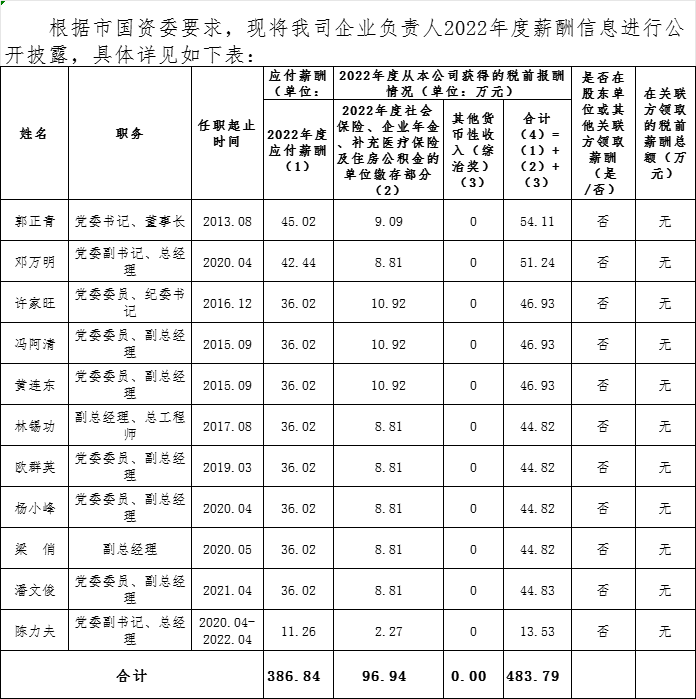 2022年度市城發(fā)集團企業(yè)負責人薪酬披露表